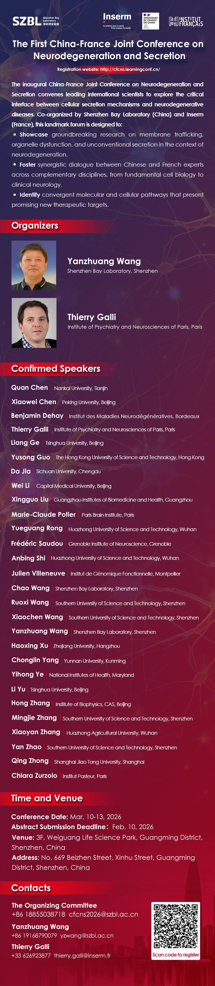 The inaugural China-France Joint Conference on Neurodegeneration and Secretion convenes leading international scientists to explore the critical interface between cellular secretion mechanisms and neurodegenerative diseases. Co-organized by Shenzhen Bay Laboratory (China) and Inserm (France), this landmark forum is designed to: